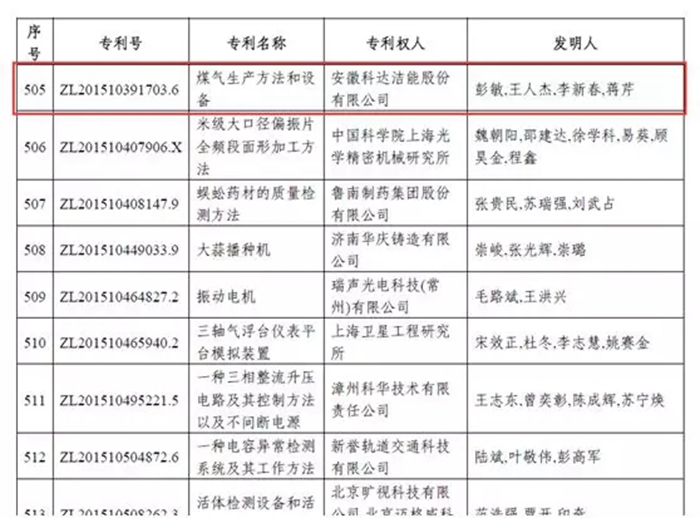 安徽科達潔能發明專利成果《煤氣生產方法和設備》獲中國專利獎優秀獎