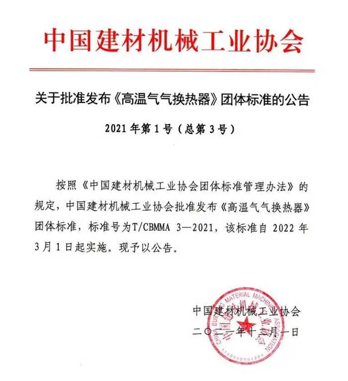 近日,中國建材機械工業協會發布公告,由安徽科達潔能股份有限公司、清華大學山西清潔能源研究院等主要負責起草的T/CBMMA 3—2021《高溫氣氣換熱器》團體標準獲批發布,自2022年3月1日起實施。