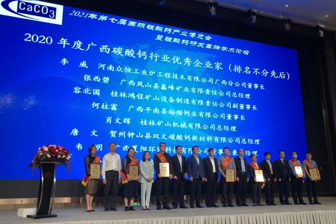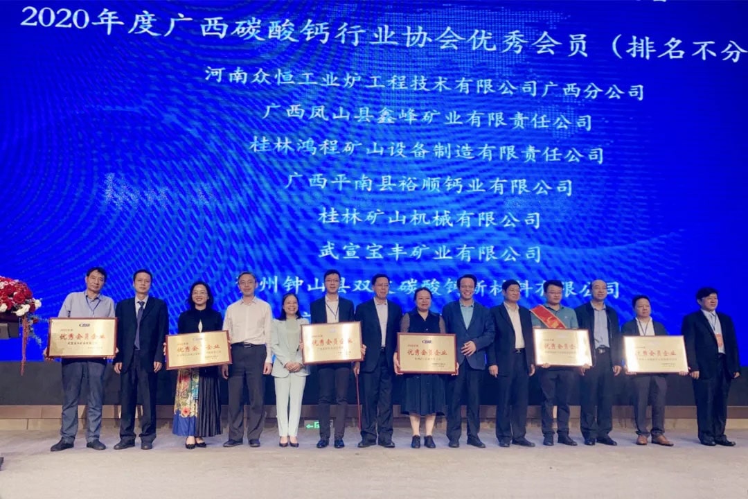 桂林礦機(jī)作為礦山機(jī)械的重要一員,公司從第一屆開始積極參與協(xié)會會議會展,公司領(lǐng)導(dǎo)也非常支持協(xié)會各項(xiàng)工作并投身綠色發(fā)展道路。會中,公司領(lǐng)導(dǎo)肖文輝獲得2020年度廣西碳酸鈣行業(yè)優(yōu)秀企業(yè)家,同時公司還榮獲了廣西碳酸鈣行業(yè)協(xié)會優(yōu)秀會員獎。